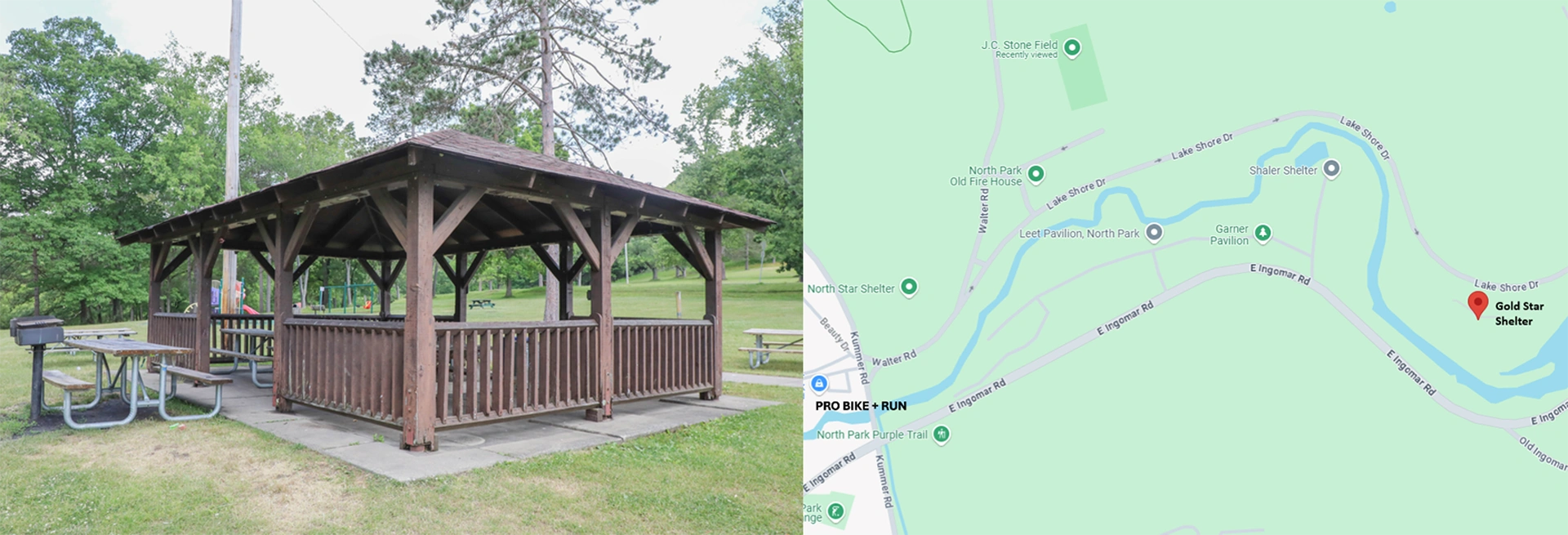 Venue Details: The Gold Star Shelter is located on Lake Shore Drive, which is a one-way road that circles North Park Lake. Google Maps recognizes it as “Gold Star Shelter,” and Apple Maps lists it as “North Park Gold Star Shelter”. It is approximately 0.5 miles from the J.C. Stone Field, and 0.8 miles from the PRO Bike + Run located on Kummer Road. Flags will be stationed at the side of the road.