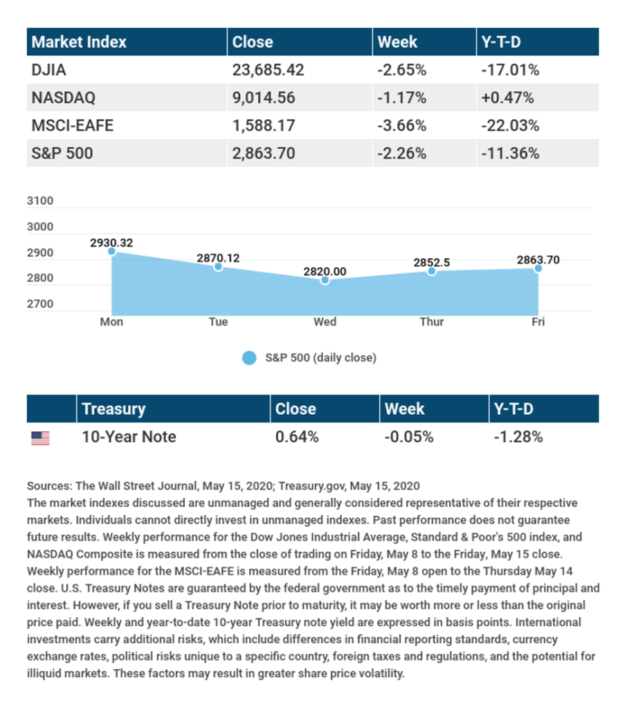 Stocks moved lower throughout most of last week on worries that the emerging economic reopening might accelerate the spread of COVID-19. Comments by Fed Chair Powell added to the downside pressure when he expressed concern about the path ahead for the U.S. economy.